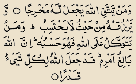 Transliteration : - “Wa mai yattaqil laaha yaj'al lahu makhraja. Wa yarzoqohu min haiso laa yahtasib. Wa mai yatawakkal alal laahe fahowa hasbohu innal laaha baalegho amrehi qad ja'alal laaho lekulle shay'in qadeer.”