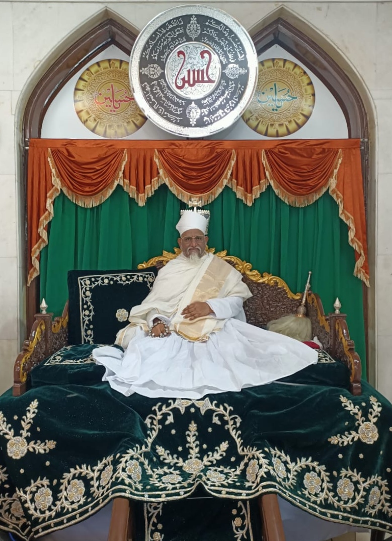 Saiyedna saheb Aqaa Maulaa (tus) is keeping Tashreef on Takht-e-Haatemi sitting on the Ba-barakat Dupatta Mubaarak of 41st Da’i ul Mutlaq Saiyedna Fakhruddin saheb (aq) when Maulaa used to wear it on the Day of ‘Aashuraa between 1325 AH to 1335 AH.