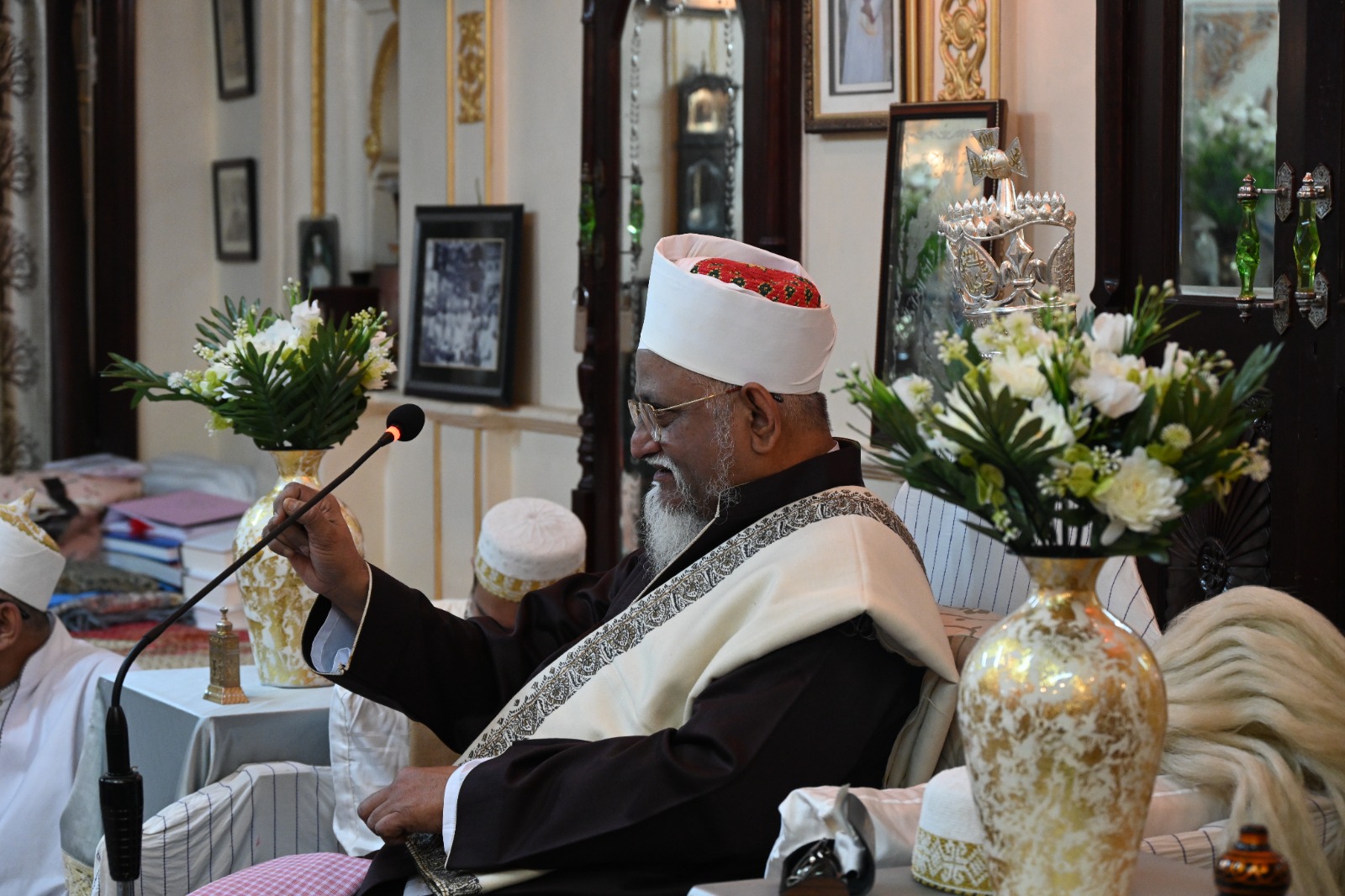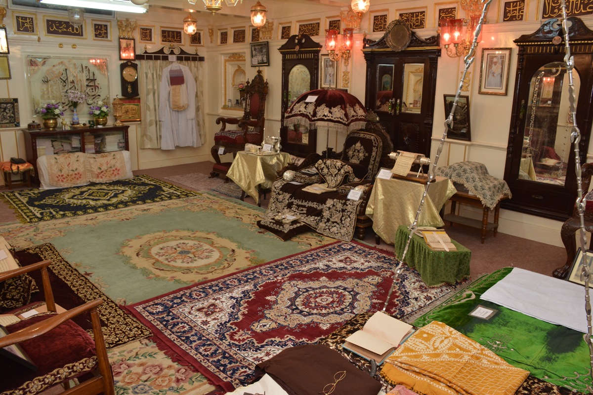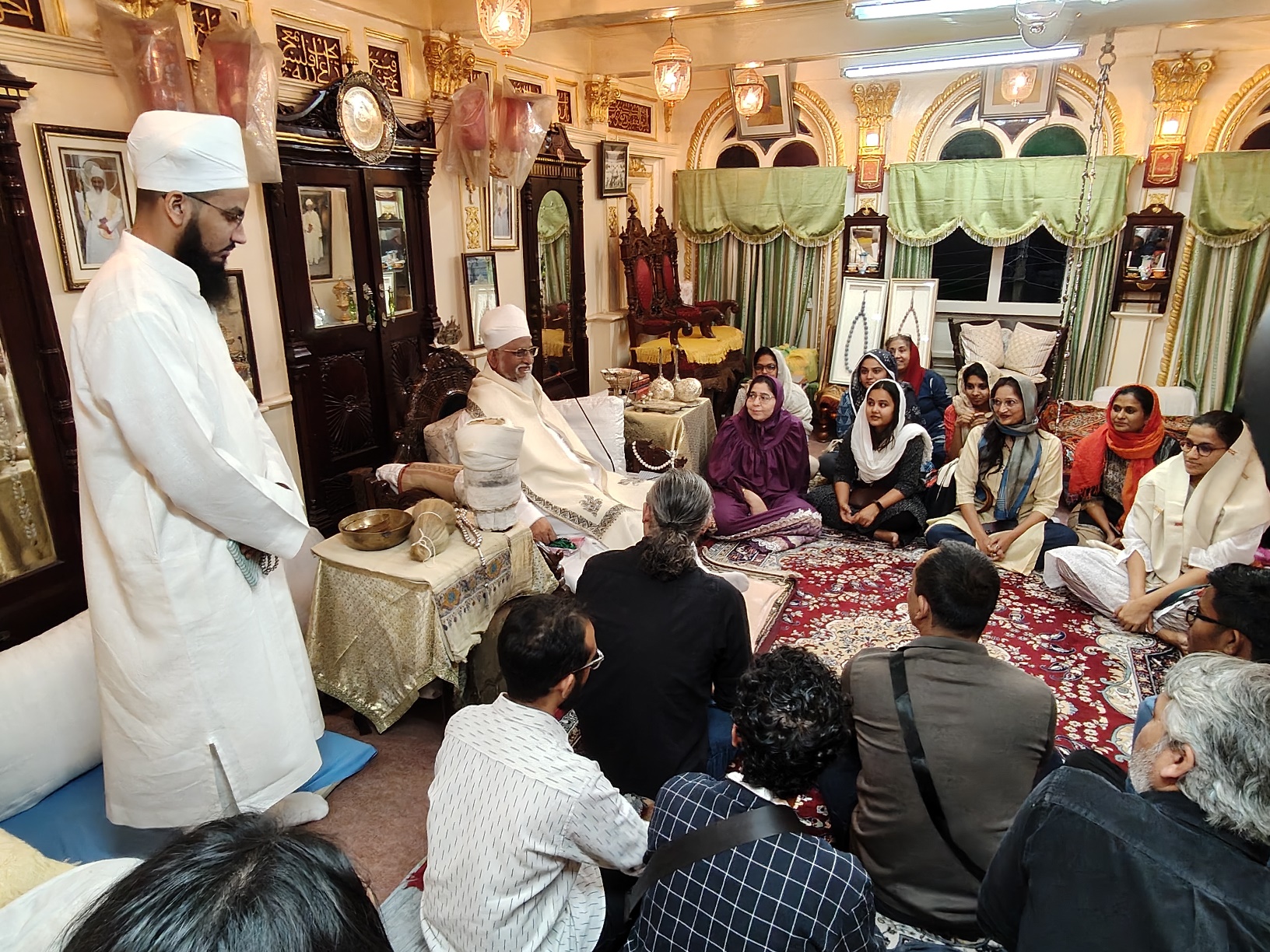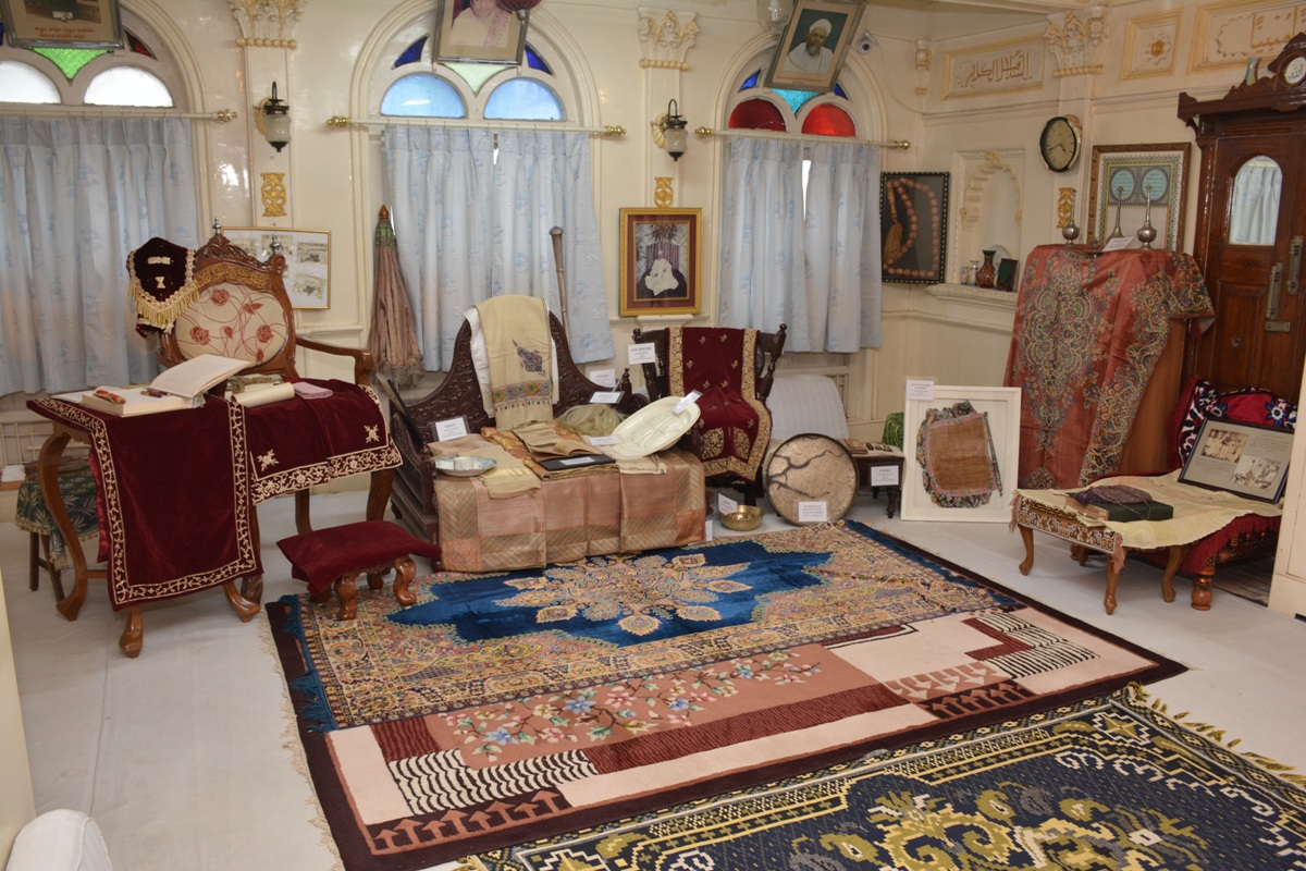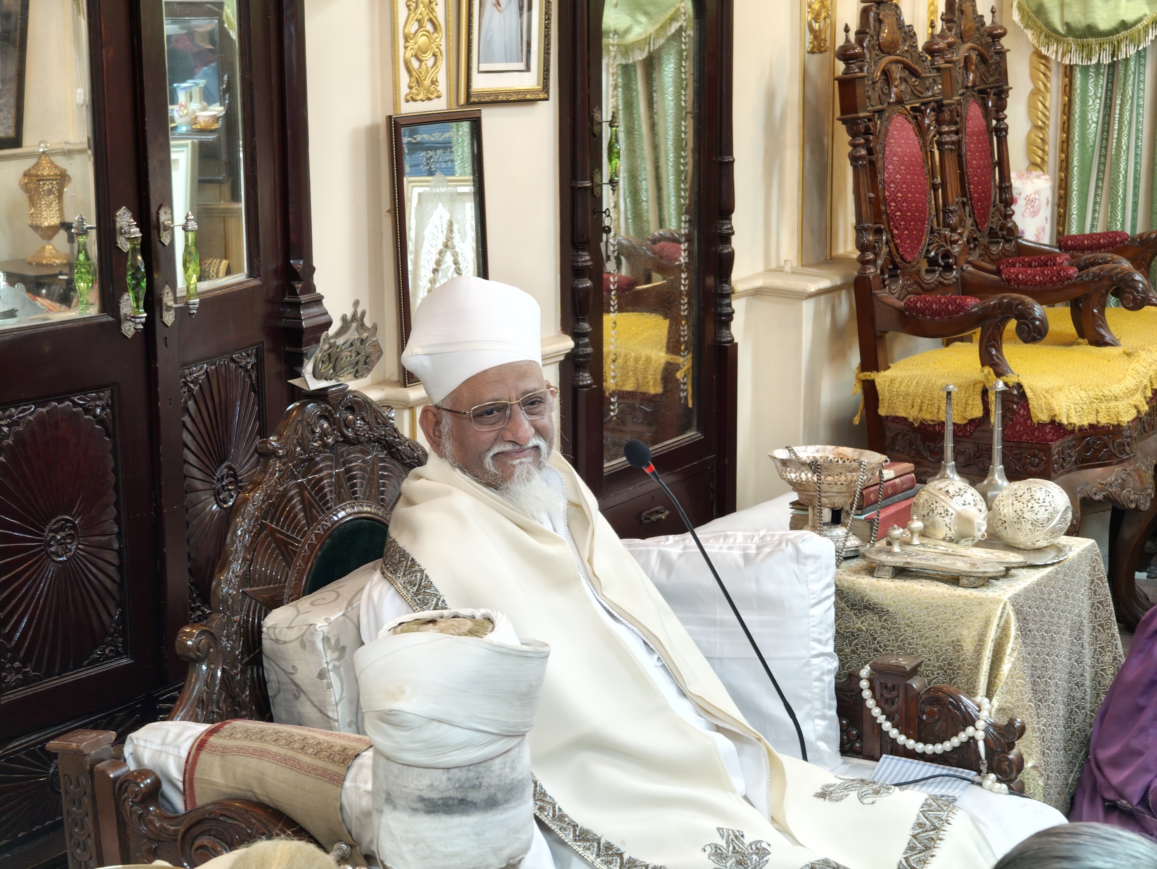 | Aqaa Maulaa Saiyedna Dr. Haatim Zakiyuddin saheb TUS on Takht e Taiyebi with several antiquities of the Legacy of Du'aat e Muqaddaseen AQ |