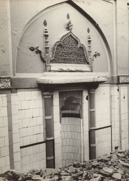 Masjid par qibla ni diwaar saathe 2 khoob-surat naazuk minaar hata. Tasweer ma mazdoor tene shaheed kari rahya che te nazar aawe che. |