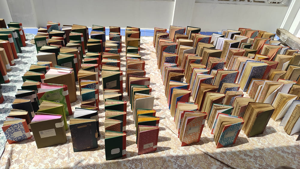 So, let me tell you why such an arrangement has been done. It has been a type of customary practice which is carried out by the librarians once a year. All the books in the picture are manuscripts which are either originally written or copied from previously existing books. The old pages are such that due to moisture, they might stick to each other and thus, utilization of those books becomes difficult.