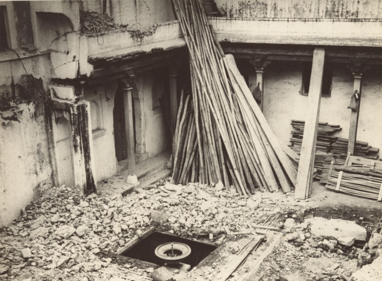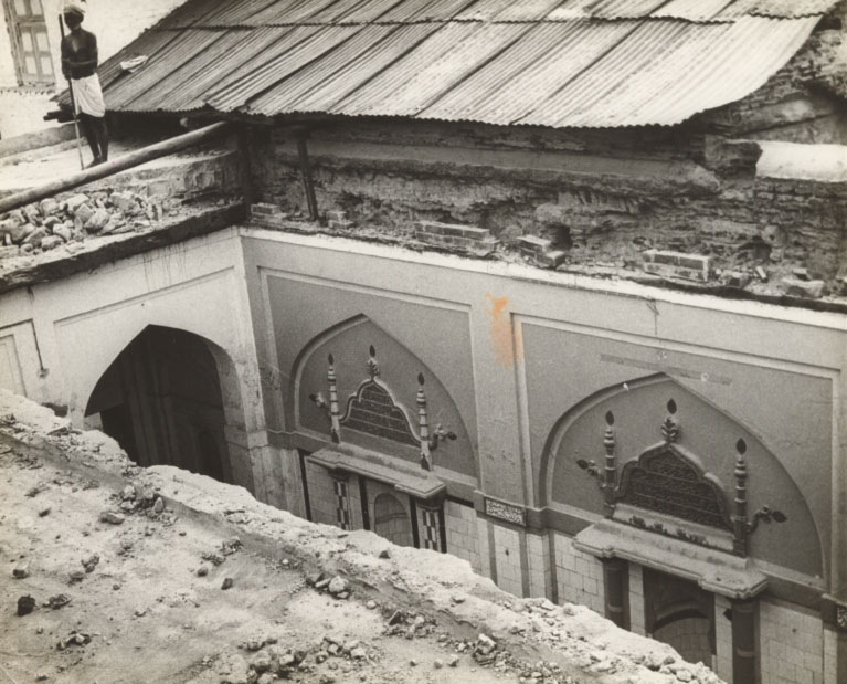 Aa qibla no photo upar thi lewaama aawo che. Masjid ne shaheed karwaanu kaam shuru thayu to pehla qibla ne nazdeek ni chat todwaama aawi. Qibla ni diwaar thi adi ne gharo hata je photo ma nazar aawe che. |