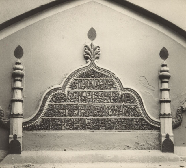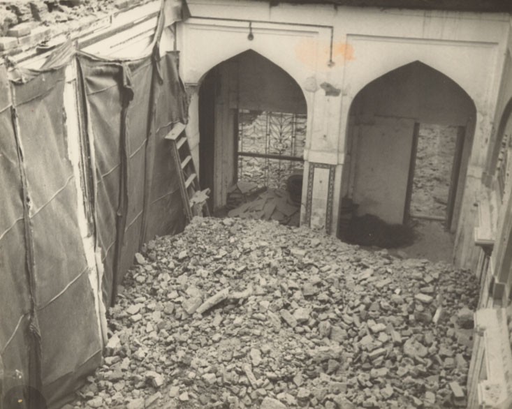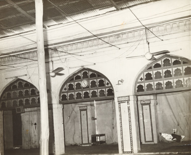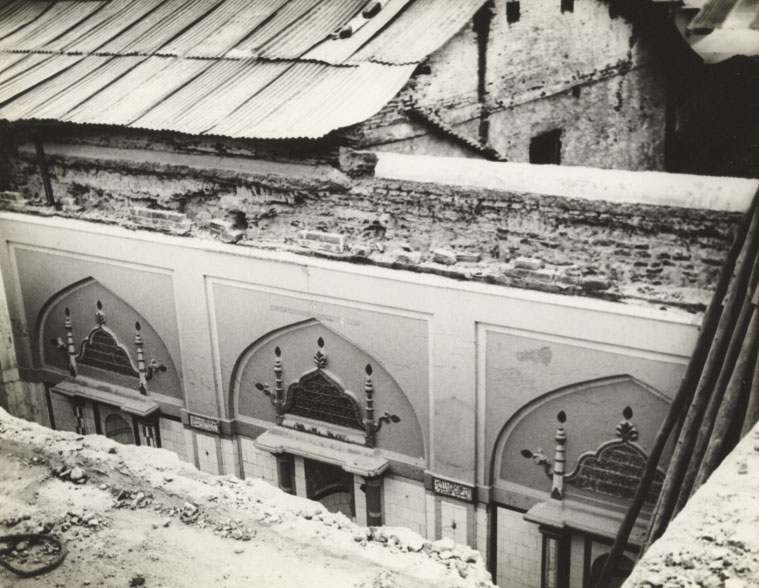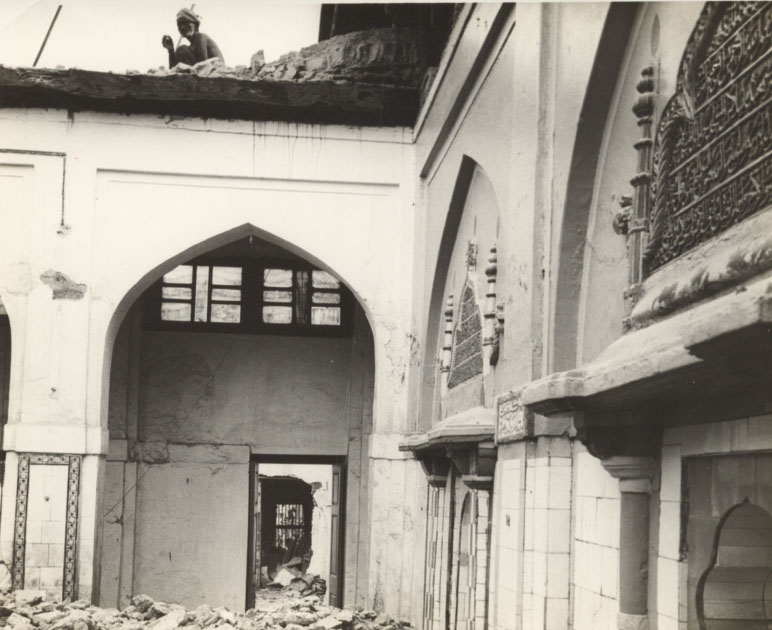 Masjid par qibla ni diwaar saathe 2 khoob-surat naazuk minaar hata. Tasweer ma mazdoor tene shaheed kari rahya che te nazar aawe che. |
