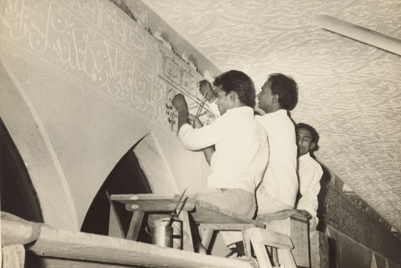Masjid-e-Nooraani ni ground floor ni diwaaro par Surat ur-Rehmaan ni ghani umdah kaarigari thi naqqaashi kidheli che. Jeni kitaabat ane khoob-surati ne jowa loko dur-dur thi aawta hata. Aa Qur'ani Surat na huroof ma sona nu waraq chadhaawwa ma aawu hatu. Te waaste Mumbai thi maahiro ane kaarigaro ne bolaawa hata. Tasweer ma Mo'een ud-Da'wat Mohammad Husain Zenithwala kaarigar saathe waat-cheet kari rahya che. |