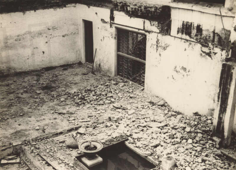 Tuteli chat no kaat-maal (rubble) nazar aawe che. Mehraab ane tena darwaaja saathe daabi side par parda latkaawela che te dekhaai che. |