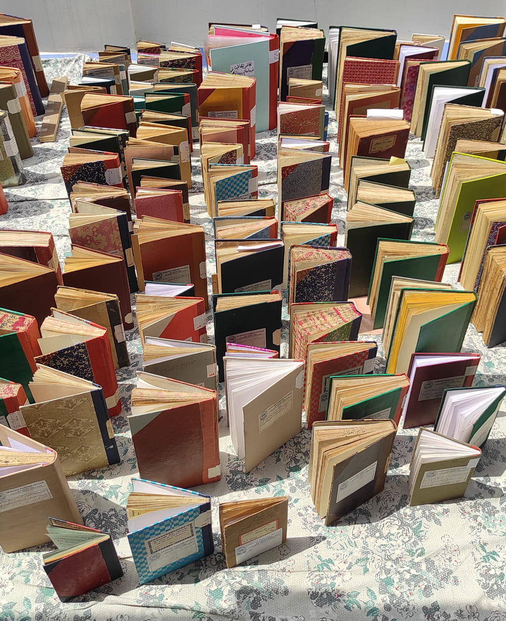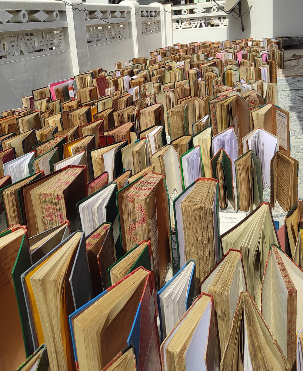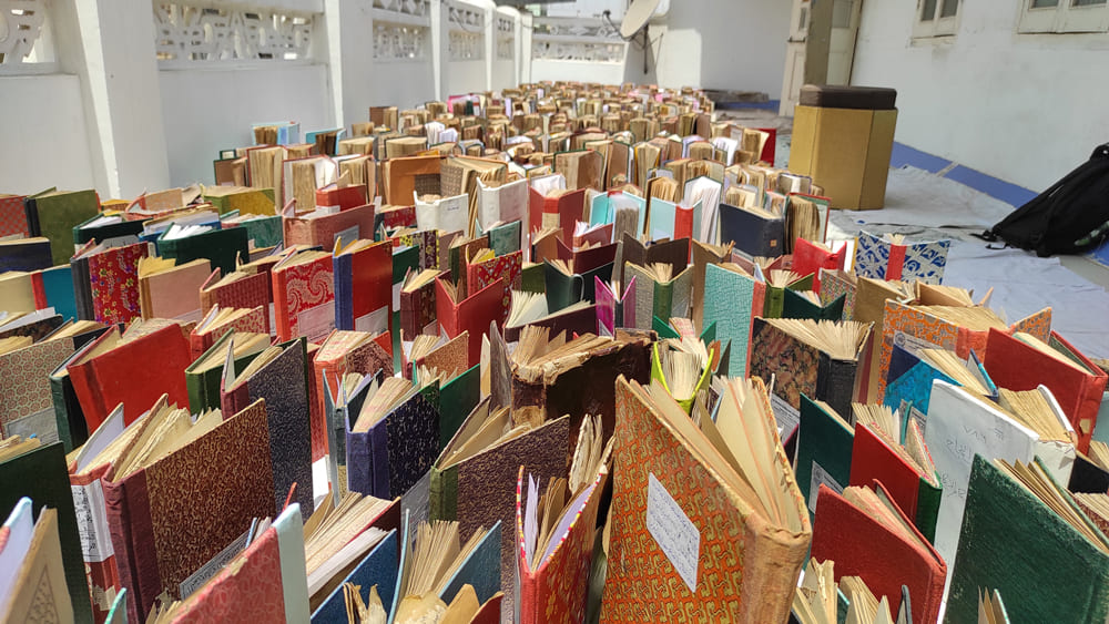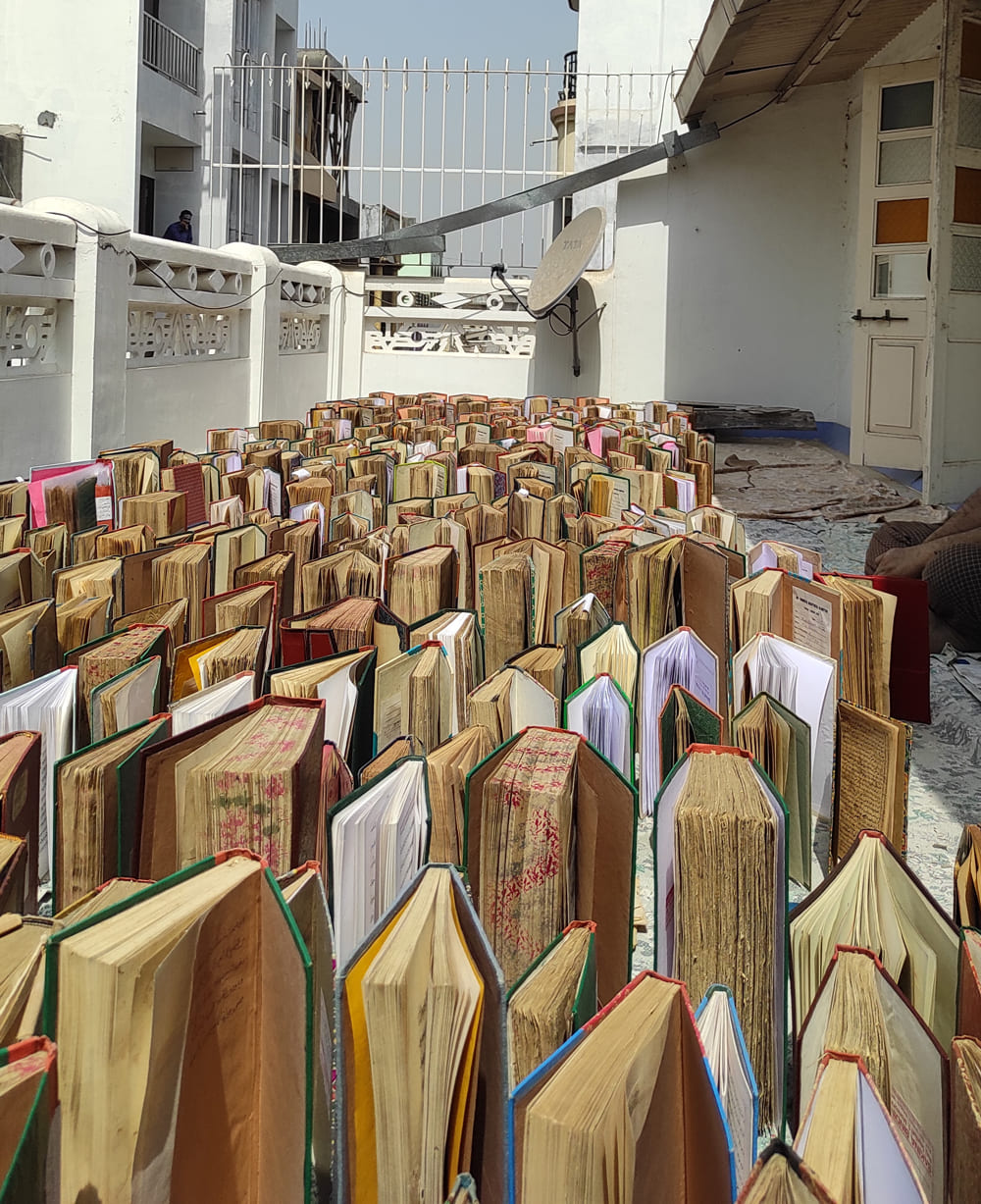 So, let me tell you why such an arrangement has been done. It has been a type of customary practice which is carried out by the librarians once a year. All the books in the picture are manuscripts which are either originally written or copied from previously existing books. The old pages are such that due to moisture, they might stick to each other and thus, utilization of those books becomes difficult.