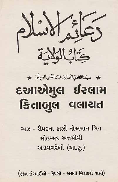 Da’aim ul-Islam – Kitab ul-Walaatay - Aa kitaab Saiyedna Qadi No’maan Saheb (QR) ni tasneef kideli chhe ane tehma Ambeyaa, Auleyaa, Imaamo ane Du’aato alayhem us-salaam waste mu’min na dil maa walaayat ane mohabbat hovi joiye tehnu bayaan chhe. |