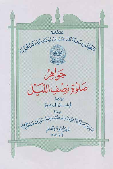 Jawaahir Salaat-e-Nisf il-Lail Aa kitaab ma Nisf-il-Lail ni namaaz no Lisaan ud-Da’wat ma tarjumo karwama aavo chhe ane munaajat temaj du’aao arabi zabaan ma chhe. |
