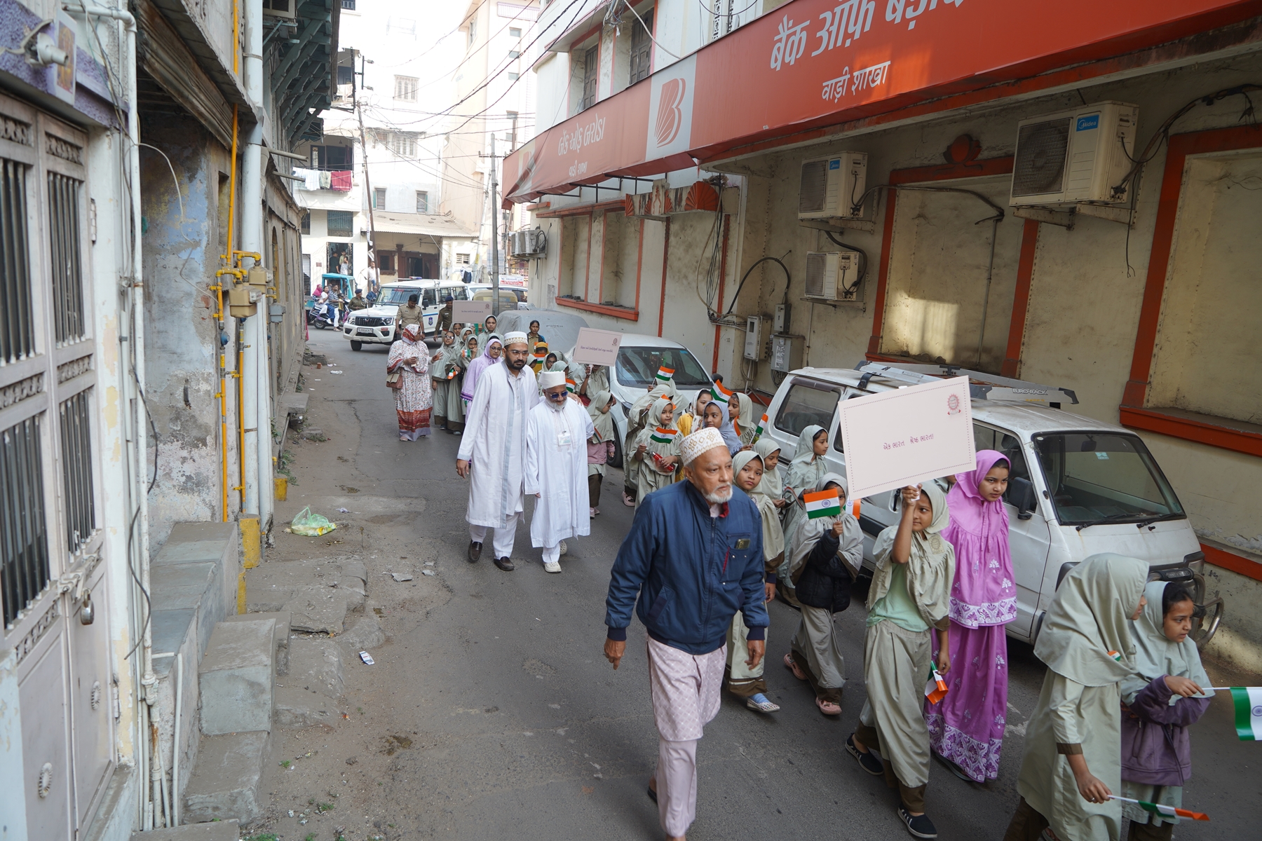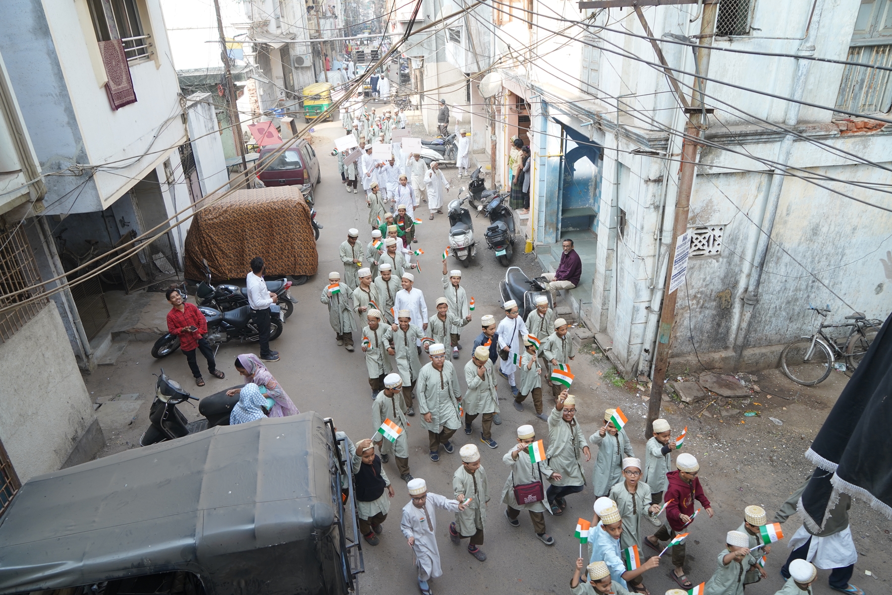 Leaving Badri Mohalla, Tiranga Rally passed through Navapura, Rangmahal, Wadi Tower, and Bhatwada before reaching Bustaan-e-Badri at Maru Faliya. Throughout the entire march, the Madrasah children displayed exemplary patriotism and discipline. Seeing the Tricolors and placards in their hands made the heart of every commuters and onlookers filled with praise and pride.