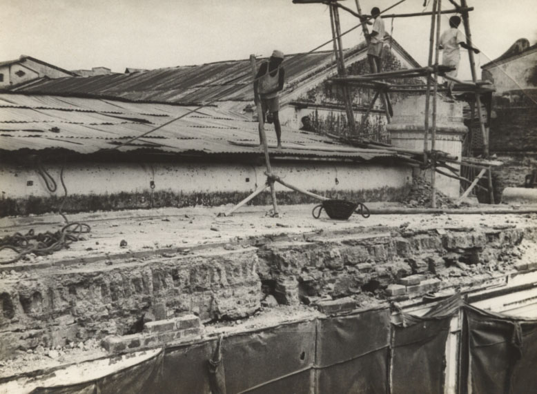 Masjid par qibla ni diwaar saathe 2 khoob-surat naazuk minaar hata. Tasweer ma mazdoor tene shaheed kari rahya che te nazar aawe che.