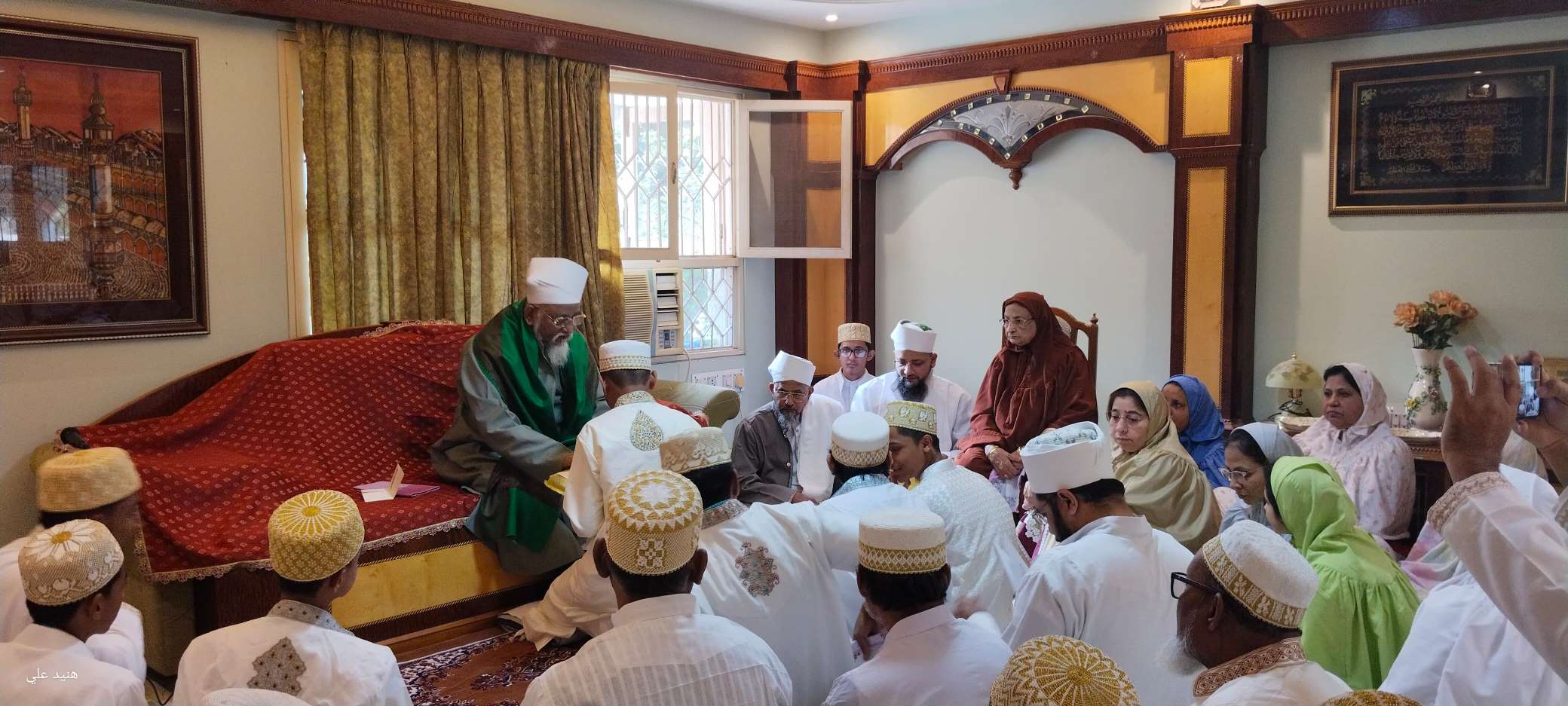 20th Rajab ul Murajjab 1446, 19/1/2025, Sunday saw a deluge of mumineen-muminaat at Daar us Salaam, the maqaam e shareef of Da'i uz Zamaan TUS, where 17 farzando-dukhtaro came to offer 'Ahd e Imaam uz Zamaan AS on the mubaarak hands of his hujjat and Naa'ib Saiyedna Dr. Haatim Zakiyuddin saheb TUS. This oath of allegiance is necessary to balance the cycle of life and death. The dot of life or a point of light originating from Imaam uz Zamaan AS is induced into the neo-mu'min who will start his lifetime journey of Faith, Actions, Patience, Truth, Justice and Contentment by strictly following the commands-Faraamin of Da'i uz Zamaan TUS.